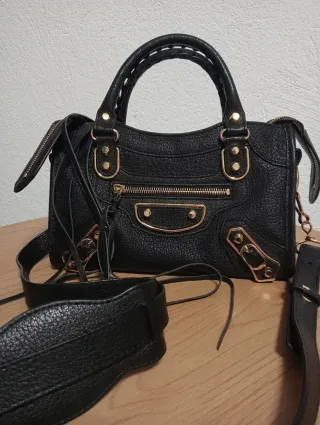 Elegante bolso de piel de la marca Balenciaga. - Acabado en piel texturizada. - Detalles metálicos en tono dorado. - Incluye correa para llevar al hombro.