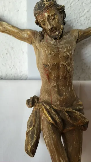 Antigua talla de madera de Cristo crucificado. Una pieza con gran detalle y carácter. - Material: Madera. - Acabado: Policromado con detalles dorados y rojos. - Estilo: Religioso.28x22cm.
