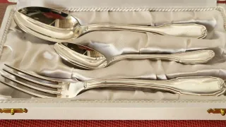 Elegante set de cubiertos presentado en una caja forrada. - Incluye tenedor, cuchara sopera y cuchara de postre. - Diseño clásico con detalles grabados en el mango. - Materiales de calidad para un uso duradero.