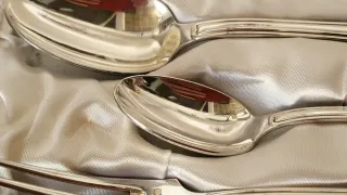 Elegante juego de cubiertos de H. FROST, presentado en su caja original. - Diseño clásico con detalles ornamentales en el mango. - Acabado brillante que refleja la luz. - Incluye un tenedor y una cuchara.