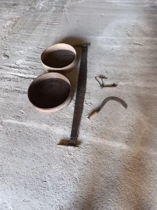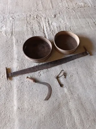Conjunto de herramientas antiguas, perfectas para coleccionistas o decoración rústica. - Serrucho de mano con mango de madera. - Hoz curva con mango de madera. - Dos tamices circulares de madera.