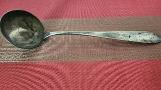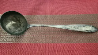 Cucharón de plata con un diseño clásico y elegante. Ideal para servir sopas, cremas o salsas. - Material: Plata - Estilo: Antiguo - Acabado: Pulido con marcas de uso