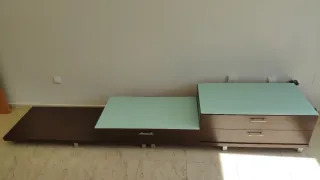 Mueble de comedor con un diseño moderno y elegante, perfecto para tu televisor. - Combina madera oscura y cristal. - Amplio espacio de almacenamiento. Medidas (Ancho x Alto x Profundo) cm: -Parte abajo: 300 x 45 x 59. -Mueble puerta corredera: 150 x 65 x 35. -Mueble puerta cristales: 100 x 96.5 x 35.