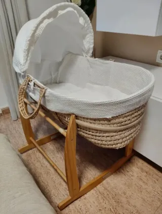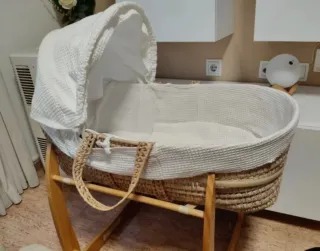 Cuna moisés de mimbre con capota y balancín de madera. - Cesta de mimbre tejida a mano. - Capota de tela blanca con interior acolchado. - Base balancín de madera natural. Apenas tiene uso.