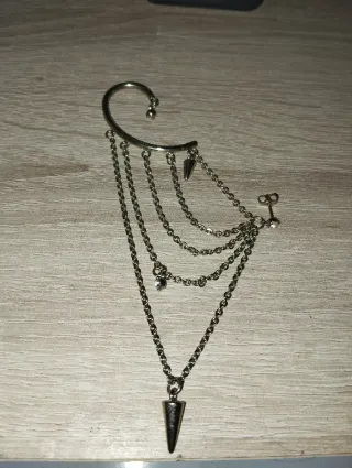 Este adorno de oreja tiene un diseño llamativo con varias cadenas colgantes y un pincho. - Diseño tipo ear cuff. - Cadenas de diferentes largos. - Detalle de pincho en la cadena más larga. - Adorno adicional en una de las cadenas. !NO HAGO ENVIOS!!