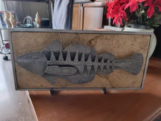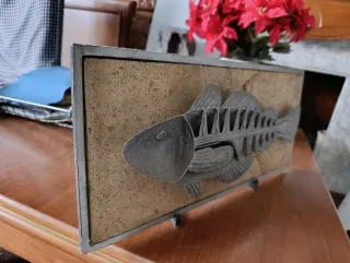 Original pieza de decoración con forma de pez hecha de hierro, también tiene una lámina de piedra incrustada, todo el fondo es de hierro también, la piedra está rota pero no se puede sacar, no afecta a la pieza. - Diseño detallado del esqueleto del pez. - Base con textura que simula piedra. - Marco metálico. Tags: Fish, Iron, Decoration, Big, Metal, Stone, Piedra decorativa Se puede pagar por Wallapay, Bizum, Transferencia Bancaria o en Mano. Pregunta si tienes alguna duda te responderé lo más rápido que pueda Si se compran varios artículos se hace descuento.