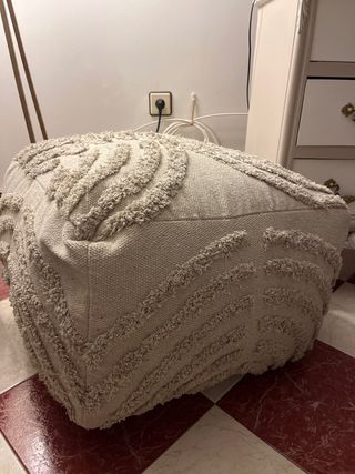 Puf de tela con un diseño texturizado. - Acabado con flecos. - Patrón geométrico. Medidas: 55x55x40cm