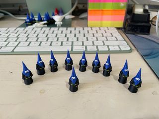Conjunto de miniaturas de nazarenos. - Figuras con túnica negra y capirote azul. Colores a elegir según paso o hermandad. - Detalle de cinturón - Ojos blancos y negros. Los precios por lotes