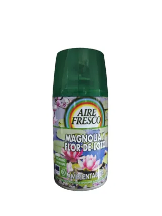 Recambio para ambientador automático Aire Fresco con fragancia de Magnolia y Flor de Loto. Diseñado para difusores automáticos. - Fragancia: Magnolia y Flor de Loto - Tipo: Recambio universal - Duración estimada: 60 días