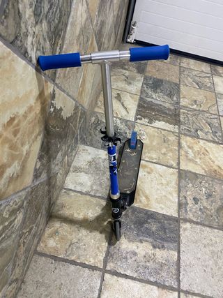 Patinete de dos ruedas con manillar ajustable y puños de goma azul. - Plataforma antideslizante. - Ruedas negras. - Diseño en color azul y plateado.