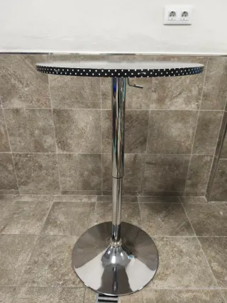 Mesa alta con un diseño moderno y funcional. Su altura no es ajustable. - Tablero con estampado de lunares blancos sobre fondo negro. - Columna central y base de metal cromado. - Base circular para mayor estabilidad. Los lunares son una pegatina, tiene roto el hidráulico y no baja.