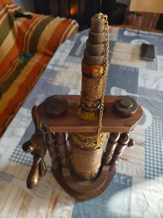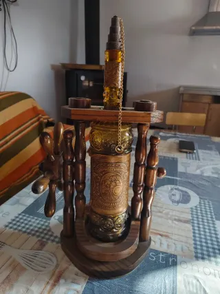 Original botellero de madera con un diseño único. - Estructura de madera oscura. - Botella central de cristal ámbar con grabados. - Cadena dorada decorativa. - Gira con un timón.