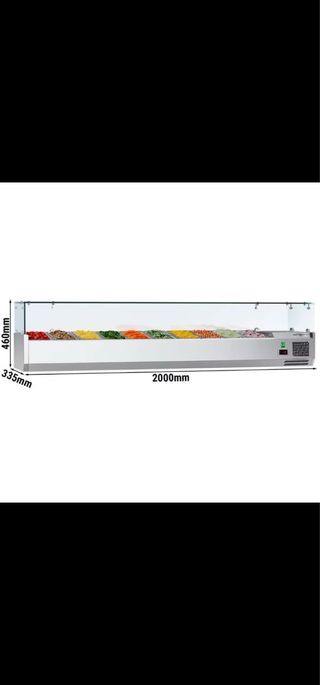 Vitrina expositora de tapas de acero inoxidable, ideal para hostelería. Para 10 bandejas Sin estrenar - Medidas: 2000mm de largo, 460mm de alto y 335mm de fondo. - Diseño moderno y funcional. - Cristal frontal.
