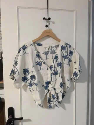 Camisa de manga corta con estampado de palmeras y detalle anudado en la parte delantera. - Diseño con escote en V. - Cierre de botones. - Tejido ligero.