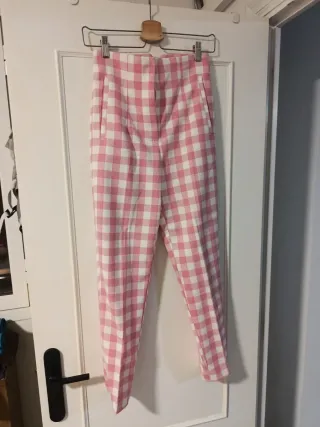 Pantalón de cuadros de Zara en tonos rosa y blanco. Diseño de talle alto y corte recto. Estilo barbiedoll preciosos una pena su venta pero no me vienen. - Estampado de cuadros. - Bolsillos laterales.