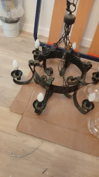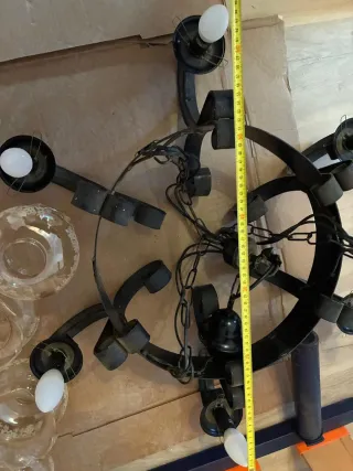 Elegante lámpara de techo con un diseño de forja. - Estructura principal en metal negro. - Detalles en cristal transparente. - Múltiples puntos de luz.