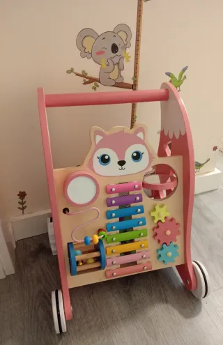 Andador de madera para bebés con múltiples actividades. - Diseño con cara de zorro. - Incluye xilófono de colores. - Ruedas de goma para proteger el suelo.