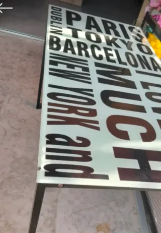 Escritorio moderno con superficie de cristal y un diseño gráfico de ciudades. - Diseño con nombres de ciudades como París, Tokio, Barcelona, Nueva York. - Combinación de colores negro y azul en el diseño.
