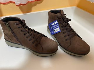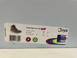 Zapato botín dela marca Joya, modelo Sonja High-Top Teak. - Material exterior: Piel Nobuk. - Material interior: Microfibra. - Número de artículo: 711cas3813. - Tallas disponibles: EUR 38 1/3, US 7.5, UK 5, ASIA 25.2. - Tecnología Swiss Technology. - Producto reciclable. Regalo de reyes. Gasto un 38.5 y me vienen muy justas. Su precio real es superior a 200 euros