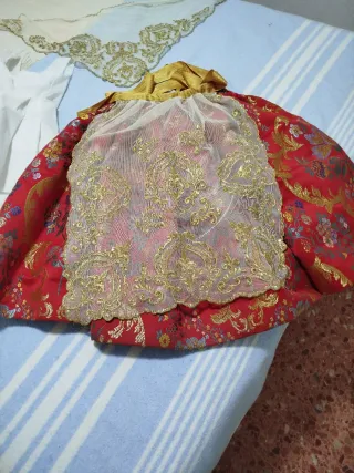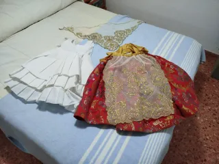 Conjunto de falda de fallera infantil y mantilla para niñas de 3 a 6 años, ahora está toda la tela sacada. - Falda de tela roja con motivos florales dorados. - Delantal de tul bordado con hilo dorado. - Mantilla de encaje blanco con detalles dorados. - Can can
