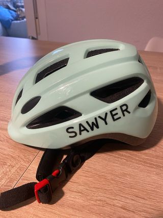 Casco de protección para niños con el nombre Sawyer escrito. - Color menta. - Diseño ventilado. - Correa ajustable con cierre de seguridad.
