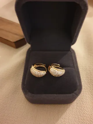 Elegantes pendientes tipo aro, chapados en oro y adornados con pequeños cristales brillantes. Vienen presentados en su caja original. - Diseño de aro. - Acabado dorado. - Decoración con cristales.