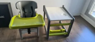 Trona infantil de la marca Jane, con bandeja desmontable y asiento acolchado. Se hace mesita escritorio para cuando se hace más mayor - Color verde lima y gris. - Bandeja extraíble. - Asiento con funda textil.