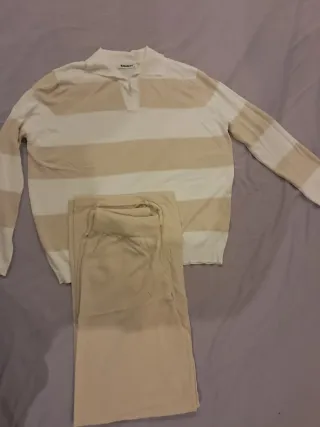 Conjunto de dos piezas con diseño de rayas. - Jersey de manga larga con cuello tipo polo. - Pantalón a juego.