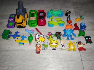 Conjunto de figuras y vehículos de juguete. - Incluye coches, motos, figuras de personajes y animales. - Colores variados: morado, amarillo, verde, rojo, azul y naranja. - Algunos artículos tienen detalles como ruedas o accesorios.