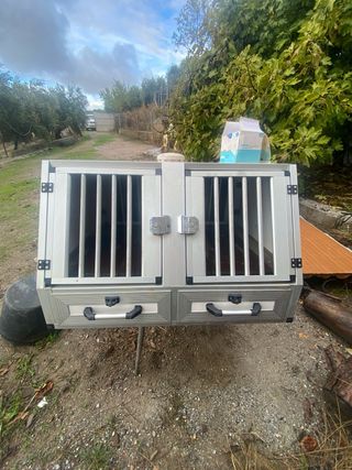 Jaula marca axesdog, cuatro compartimentos.Extractor solar de aire. cerraduras en todas las puerta y cajones. 4 compartimentos para perros. 2 cajones para guardar cosas . Muy poco uso . Actualmente la tengo en una nissan navara. Todo aluminio y chapa sandwich