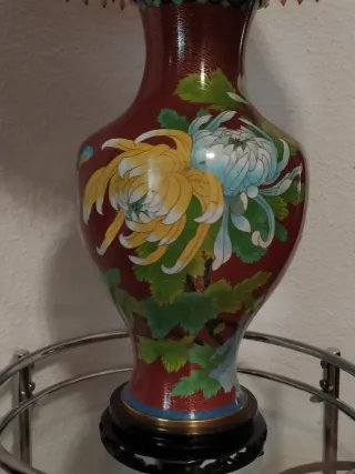 Elegante lámpara de mesa de estilo clásico. Su diseño combina cerámica y tela para un toque sofisticado. - Base y cuerpo de cerámica con detalles pintados. - Pantalla de tela plisada en tono rojo. - Adornos dorados en la pantalla y la base. - Base en madera tallada. - Leve abollamiento en cuerpo central (foto).