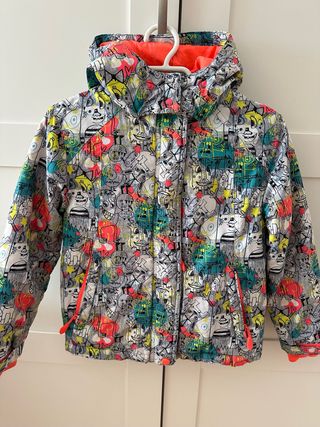 Abrigo infantil con un divertido estampado de monstruos y colores vibrantes. -Cierre a cremallera más velcros - Estampado multicolor con diseño de personajes. - Forro interior capucha y elástico en mangas de color naranja fluorescente - Cremalleras laterales de color naranja. cierre interior extra en la base del abrigo para un mayor ajuste -los dedos pulgares se pueden sacar por las mangas