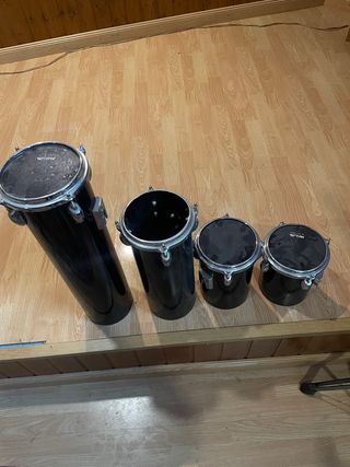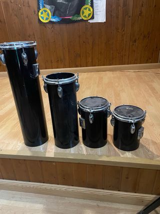 Conjunto de octotones de percusión en color negro. Son ideales para añadir ritmos a tu música. - Cuatro tambores de diferentes tamaños. - Acabado brillante. - Aros y tornillos plateados.