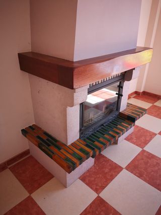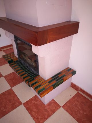 Chimenea desmontada con un diseño moderno y elegante, no incluye tubos ni revestimiento de pladur del cañón. - Estructura principal de piedra. - Detalles en madera. - Hogar de hierro con Frontal de cristal. El precio puede ser negociable.