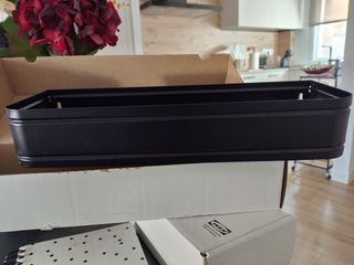 Estante de pared LILLASJÖN de Ikea con 5 ganchos. - Diseño moderno y funcional. - Acabado en color negro. Almacenaje y colgador, todo en uno. El borde impide que botes, joyas, cepillos y otros objetos acaben cayendo al suelo. Material Acero galvanizado, Revestimiento en polvo Mantenimiento Limpiar con un paño humedecido con un detergente suave. Aguanta hasta 10kg VENDO DOS ESTANTES, DOS POR UNO. SIN EMBARGO A CADA UNO LE FALTA LOS TORNILLOS CON LOS QUE SE PONE EN LA PARED.