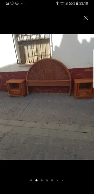 Conjunto de muebles de dormitorio de estilo rústico. - Cabecero de mimbre con diseño curvo. 160 largo por 128 alto - Dos mesitas de noche a juego con un cajón cada una. 63 ancho, 39 fondo y 56 alto Comoda 76 largo, 47 fondo y 66 cm de alto