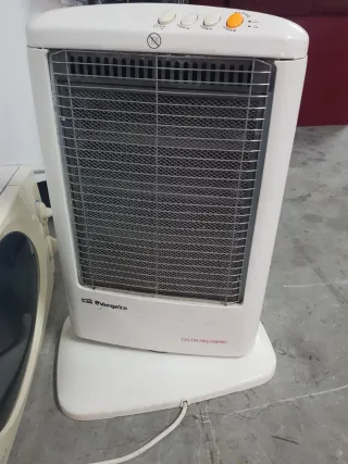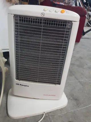 Estufa eléctrica de la marca Orbegozo. Un aparato funcional para calentar estancias. Sólo funciona la parte baja que se ve encendida en la foto. Gira lateralmente. - Diseño vertical. - Rejilla protectora frontal. - Base estable. - Indicador de Calor Halógeno.