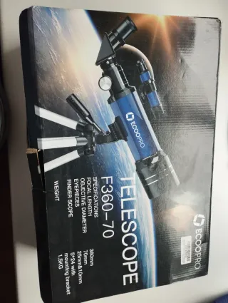 Telescopio modelo F360-70 con trípode y accesorios. - Longitud focal: 360mm - Diámetro objetivo: 70mm - Oculares: 25mm y 10mm - Incluye buscador y soporte de montaje - Peso: 1.5KG Cómo nuevo. Con sus plásticos. En su caja. Sin uso. Rebajado. Sin devolucion