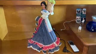 Muñeca tradicional de Marín, vestida con traje regional. - Traje de lunares azul y blanco con detalles rojos. - Delantal blanco. - Canasta con frutas. Le falta un gajo de uva y tiene un poco de polvo.