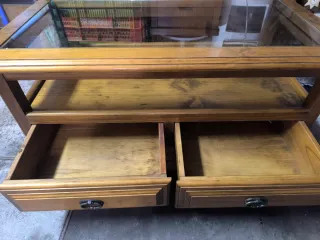 Elegante mesa de centro con un diseño moderno y funcional. Combina la calidez de la madera con la transparencia del cristal para crear un punto focal en tu salón. - Encimera de cristal. - Estructura de madera. - Dos cajones con tiradores.