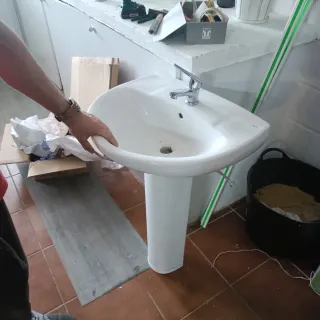 Conjunto de lavabo con pie y grifo de la marca Roca. Se encuentra en muy buen estado. - Lavabo de porcelana. - Pie de soporte. - Grifo cromado.