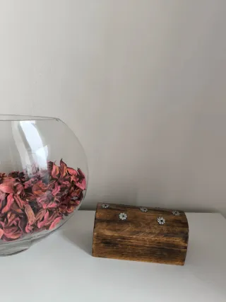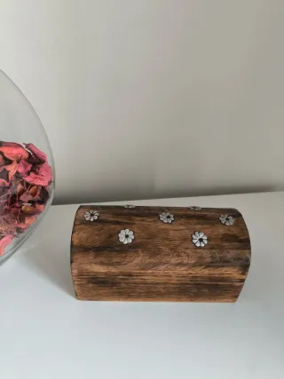 Pequeño baúl de madera con un diseño encantador. - Decorado con pequeños detalles metálicos en forma de flor. - Acabado en tonos marrones naturales de la madera. - Ideal para guardar tus pequeñas joyas.