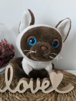 Adorable peluche de gato con un diseño encantador. - Peluche de gato estilo siamés. - Ojos grandes y azules. - Detalles de pelaje marrón y blanco.