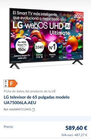 Televisor LG de 65 pulgadas con tecnología webOS UHD AI Ultimate. Modelo UA75006LA.AEU. - Pantalla de 65 pulgadas. - Inteligencia artificial AI Ultimate. - Sistema operativo webOS. - Eficiencia energética: Clase F.