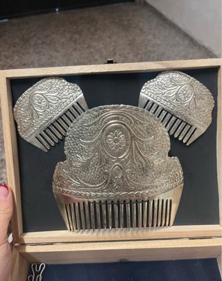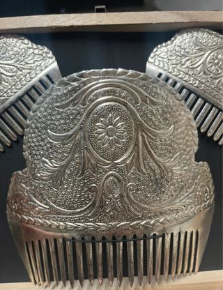 Conjunto de peinetas de fallera con un diseño intrincado y elegante. - Elaboradas con un acabado plateado. - Diseño floral y ornamental. - Perfectas para trajes regionales.