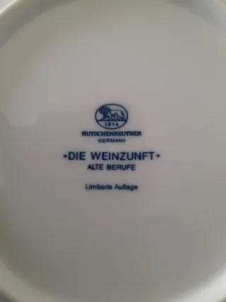Plato decorativo de colección de la marca Rutschenreuther. De 1970. 20 cm de diámetro. - Diseño Die Weinauktion (La subasta de vino). - Ilustración detallada de una bodega con barriles y personas. - Borde festoneado con detalles en verde.
