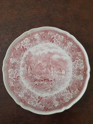 Precioso plato decorativo de Villeroy & Boch con un diseño campestre. Serie "Burgerland ". Ceramica alemana. - Diámetro de 32 cm. - Motivo de castillo y paisaje. - Borde festoneado con detalles florales.