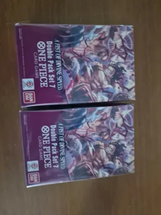 No negociable. Pack de dos cajas de cartas del juego de cartas One Piece. - Set 7: A Fist of Divine Speed. - Producto oficial de Bandai. - Cada caja contiene un doble pack de cartas.