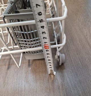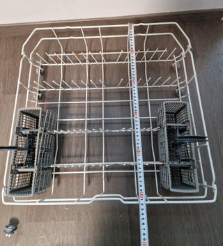Cesta inferior para lavavajillas, ideal para organizar tu vajilla. - Fabricada en metal blanco. - Bandeja extraíble para cubiertos.