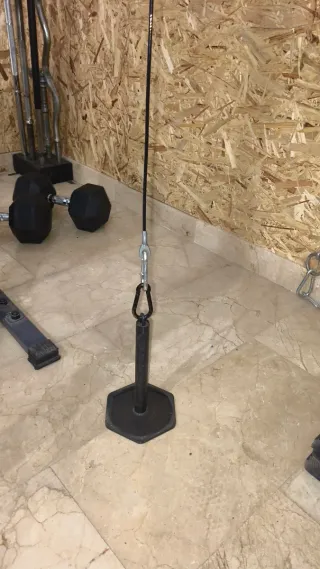 Sistema de polea para ejercicios de gimnasio en casa. Ideal para complementar tu rutina de entrenamiento. - Incluye dos cables y accesorios de sujeción. - Diseñado para montaje en pared o techo.